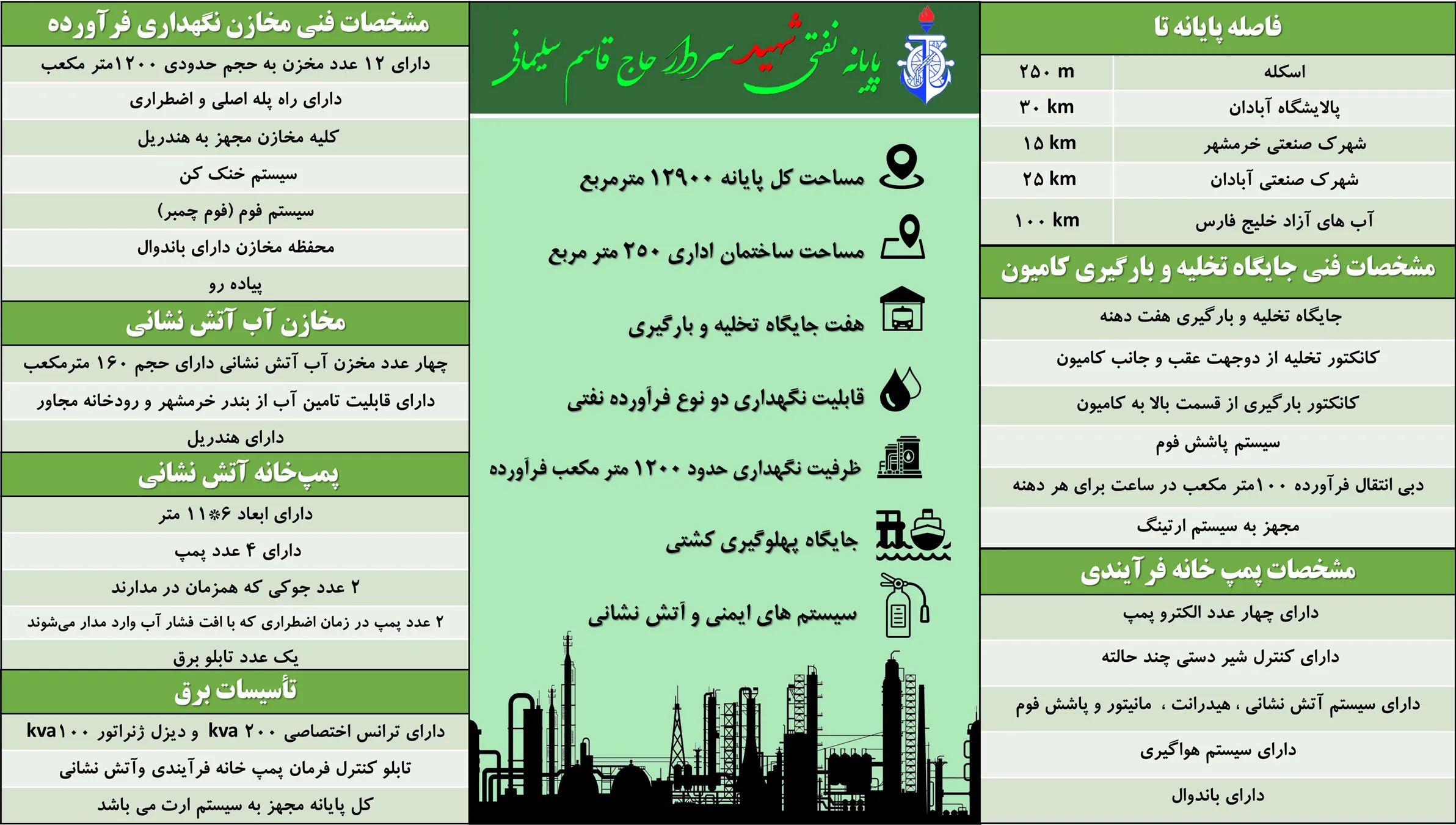 پایانه نفتی شهید سردار قاسم سلیمانی، واقع در خوزستان و بندر خرمشهر، یکی از پیشرفته ترین پایانه های نفتی ایران است که به نام سردار شهید سردارقاسم سلیمانی نامگذاری شده است. این پایانه با هدف تسهیل عملیات بارگیری و تخلیه نفت خام و محصولات نفتی طراحی شده و نقش کلیدی در زنجیره تأمین و انتقال انرژی در کشور ایفا میکند.